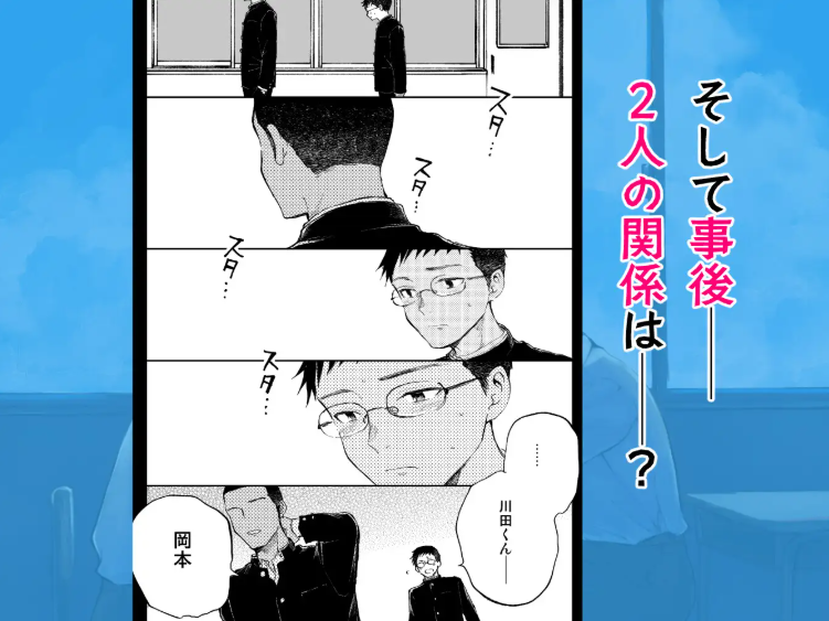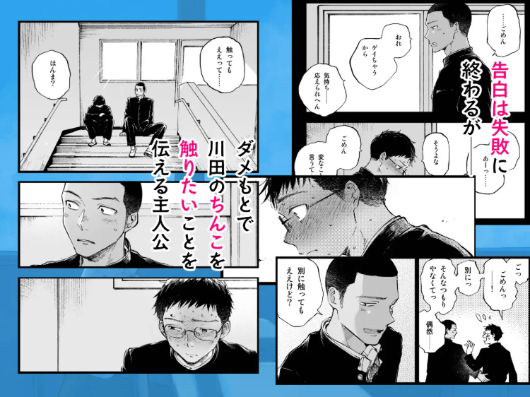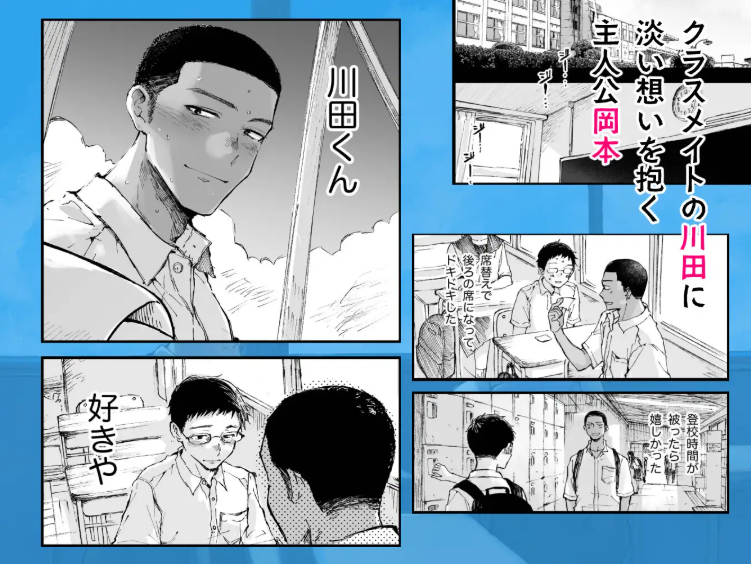 体育の着替え中に川田くんのちんこを初めて見たときの岡本くんの心臓のバクバク感や、川田くんをおかずにオナニーしてしまったときの罪悪感がすごく伝わってくるので、ゲイでない人も心にグッとくるはずです。
