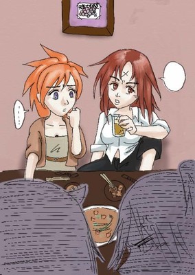 魔王がリューク氏のビールにタバスコを入れて喧嘩してる最中、女子力低い女同士のイザラさんとスミレが、二人とも恋愛経験少ないのに不毛な恋バナをする様子。