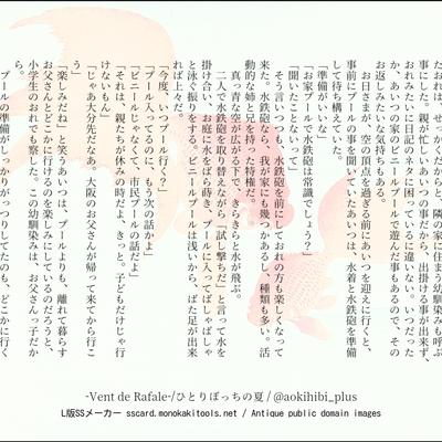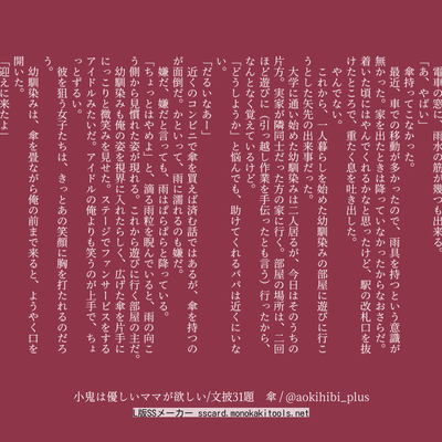 Twitterに載せた、SS名刺メーカー、文庫メーカー、ヘッダーメーカー等で作った作品をまとめています。一部の作品は、短編集にも収録済みです。