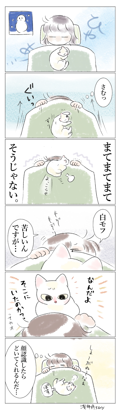 私の顔側の布団のフチ=自分の寝場所と思ってる節がありそうな白モフ。