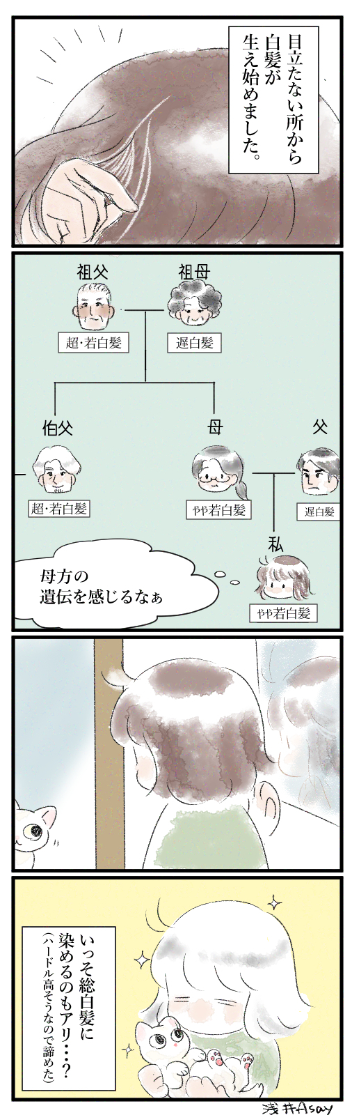 母方の祖父は20歳前には白髪が目立ってたらしいし、伯父は30半ばには髪の大半が白髪になってた記憶……。