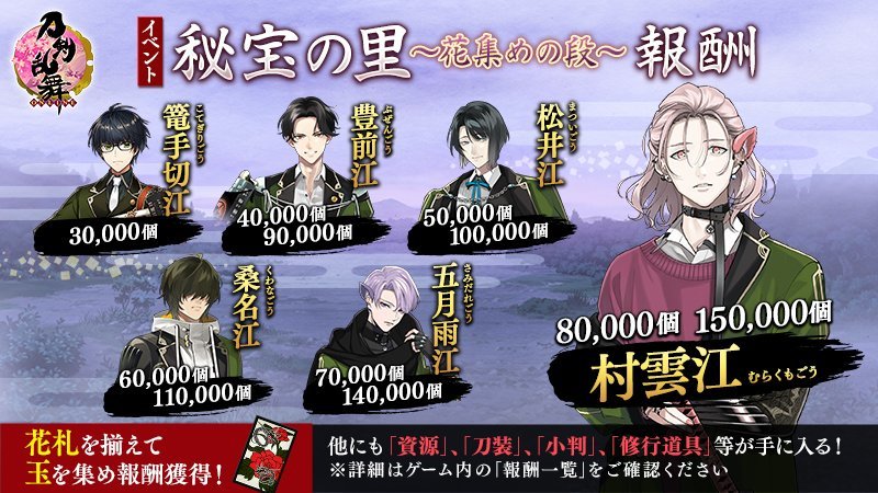 まだ6人いない時は次の江まであと2~3万貯めないといけないのかぁ…ってやる気が出なくなって何度か松井を諦めたものですが(いつも犠牲者は松井)(りーだーも1回見送ったことあるけど毎回シール交換してるからノーカンで!)、6人もいると間隔が短くていいです。雲さん二振り目までちゃんと頑張ろ!景趣・花菖蒲