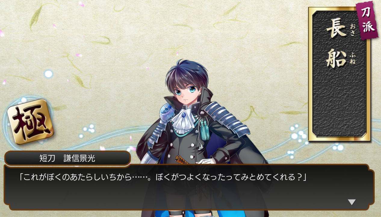 連隊戦は琉球刀三振りの各能力が優秀すぎて全員入れていたんだけど、カンストした北谷菜切に大量の経験値が入るの見てるとやっぱ別の子に渡したいよな~ってなって北谷菜切外しちゃいました。来年までにナチリの極来るといいな。治金丸も。謙信くん帰ってます!