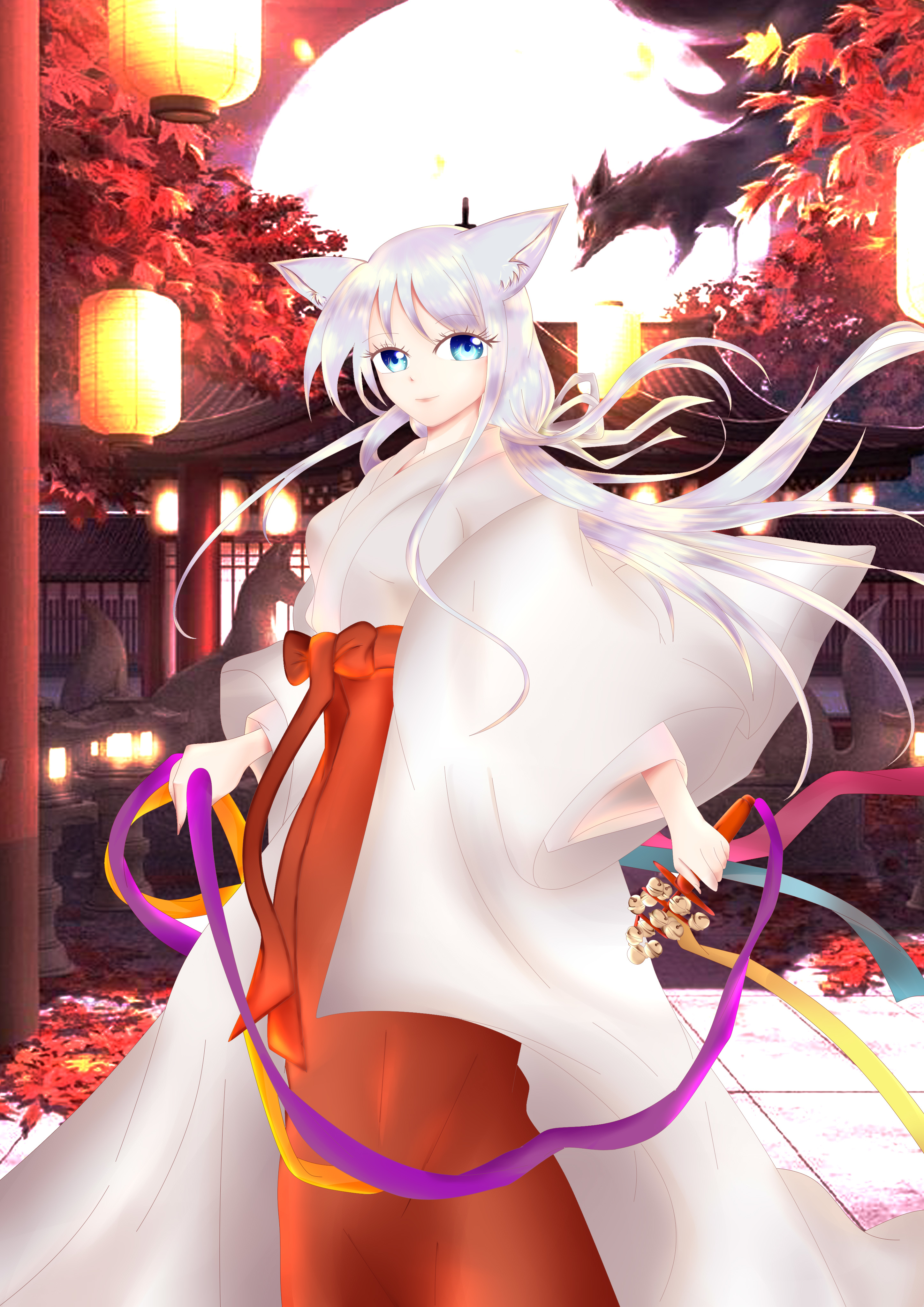 おにぎり (非ログイン)2023/06/07 07:03月明かりを背に紅葉🍁と提灯と美しい白髪狐さんが