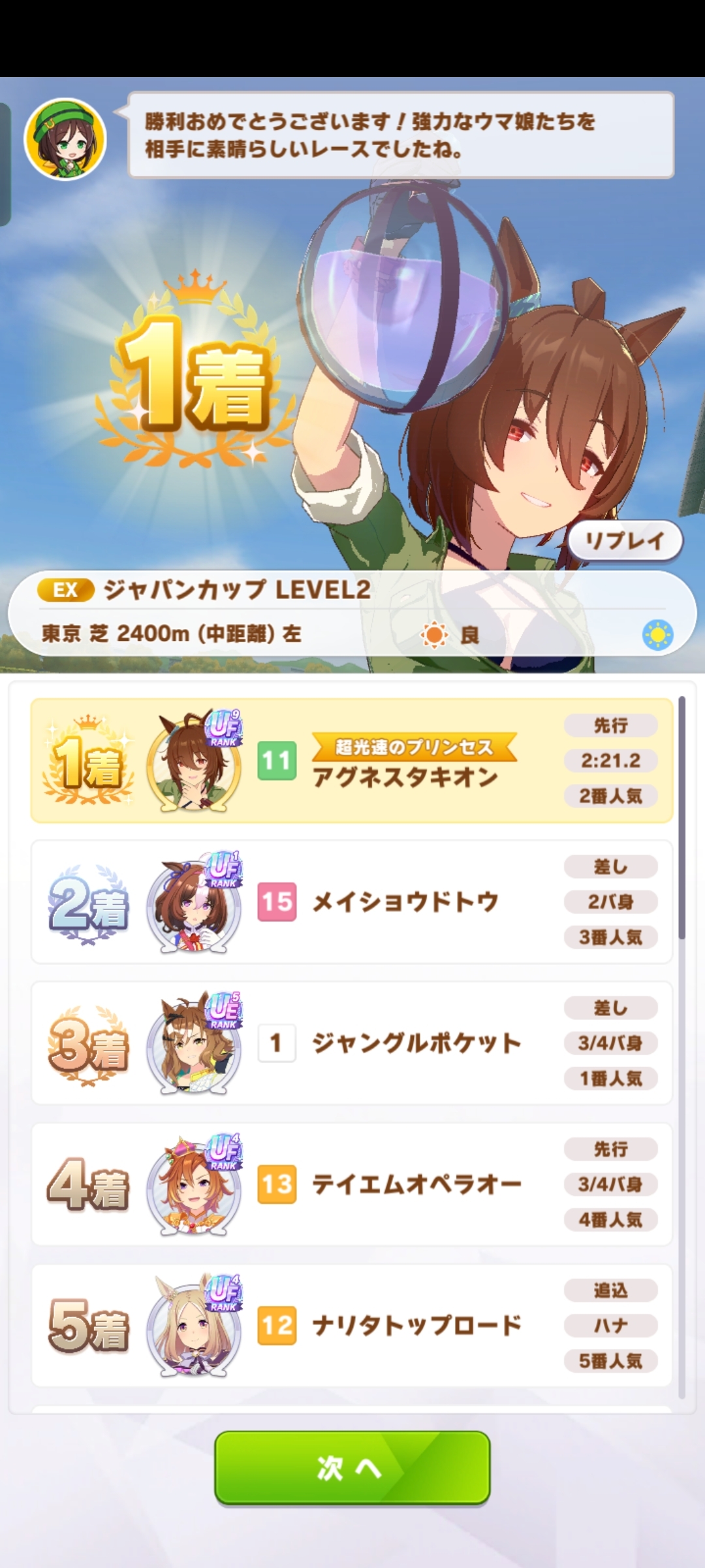 レベル2、番狂わせな勝利です。正直リプレイ見てもなぜポッケちゃんに勝てたのかわからない。