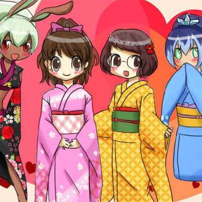 左からバニー・ミント、イナホ、フミちゃん、ふぶき姫 振り袖衣装です
