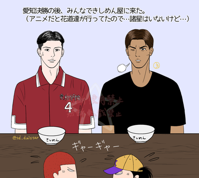 アニメでは諸星登場回の次の話で花道達がきしめん屋に行く描写があったので、もし諸星も合流してたらこうなったかなーと。