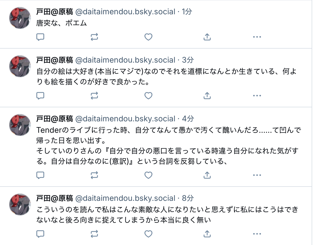20250624(火)11:13コメントする ( 0 )MBTIもセクシュアリティも、自分はこうであると当てはめることで思考を停止したいという気持ちが湧くときと、言語化できない感情を大事にさせてくれよ!!!と暴れたくなる気持ちが両方ある(仕事しな).