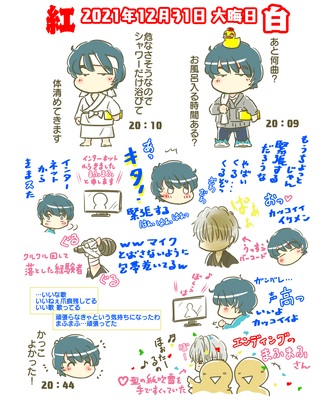 まふさんの大舞台紅白を同時配信で見守るそらるさん。ツイートと共に思い出に残したくて。ひと月経つ前に描けて良かった、ホッ。久々に配信、紅白と見直しましたが、同時に再生すると臨場感でるぅ~