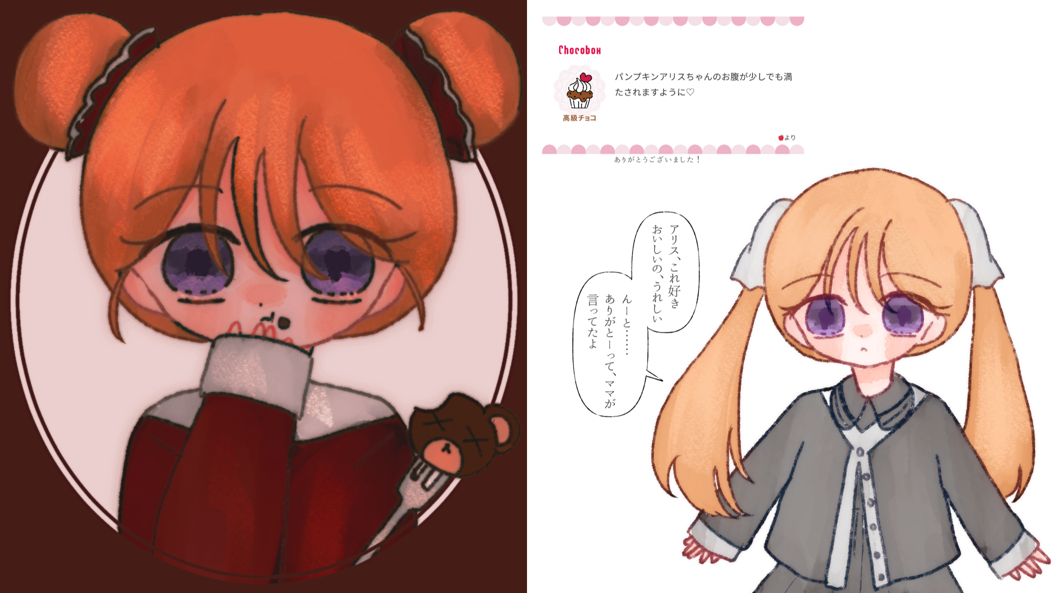 単発創作に登場するパンプキンアリスです。いつもおなかをすかせているので、食べものをもらえてきっととても嬉しかったはず。