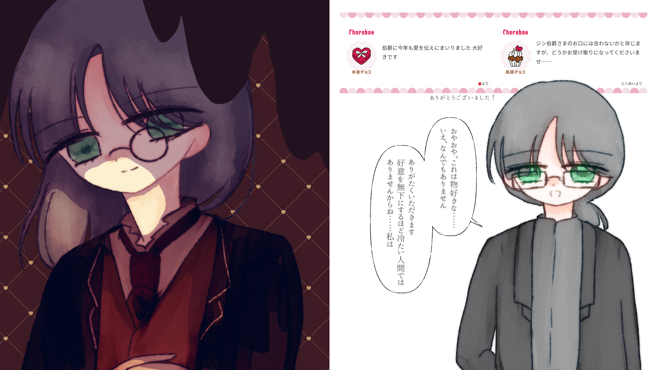 イベントごとに自分から参加するタイプではありませんが、渡されたならお礼を言うし返礼も用意してくれます。お返事の方では髪を結んで眼鏡をかけてもらいました!伯爵としては結構ラフなお姿です。