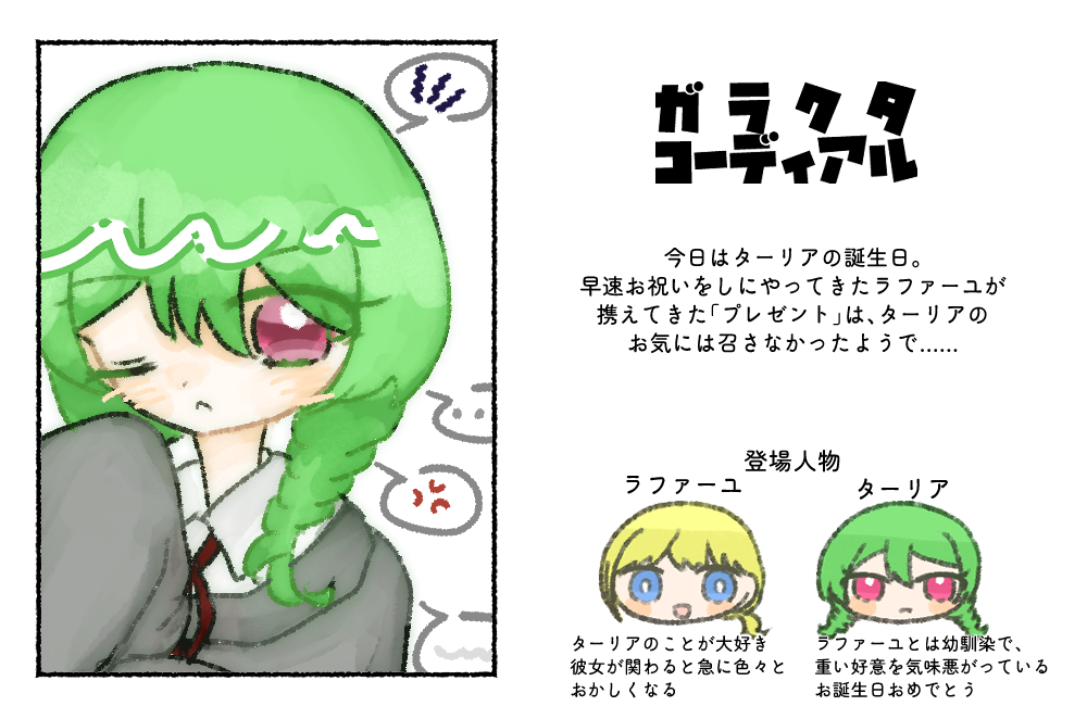 ターリアは自分のお誕生日に興味はありませんが、ラファーユは2か月ほど前からカウントダウンしていると思います。半年前からプレゼントを探していそう。(短編では、そのくらいがんばって探したのに……!?という感じですが……好きすぎてだね……)