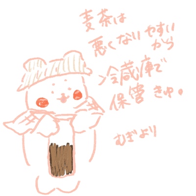 わが家の生活指導ついたんの「むぎ」ちゃんのイラストです。 真夏の麦茶の管理について、冷蔵庫保管をおすすめしております #しろたん