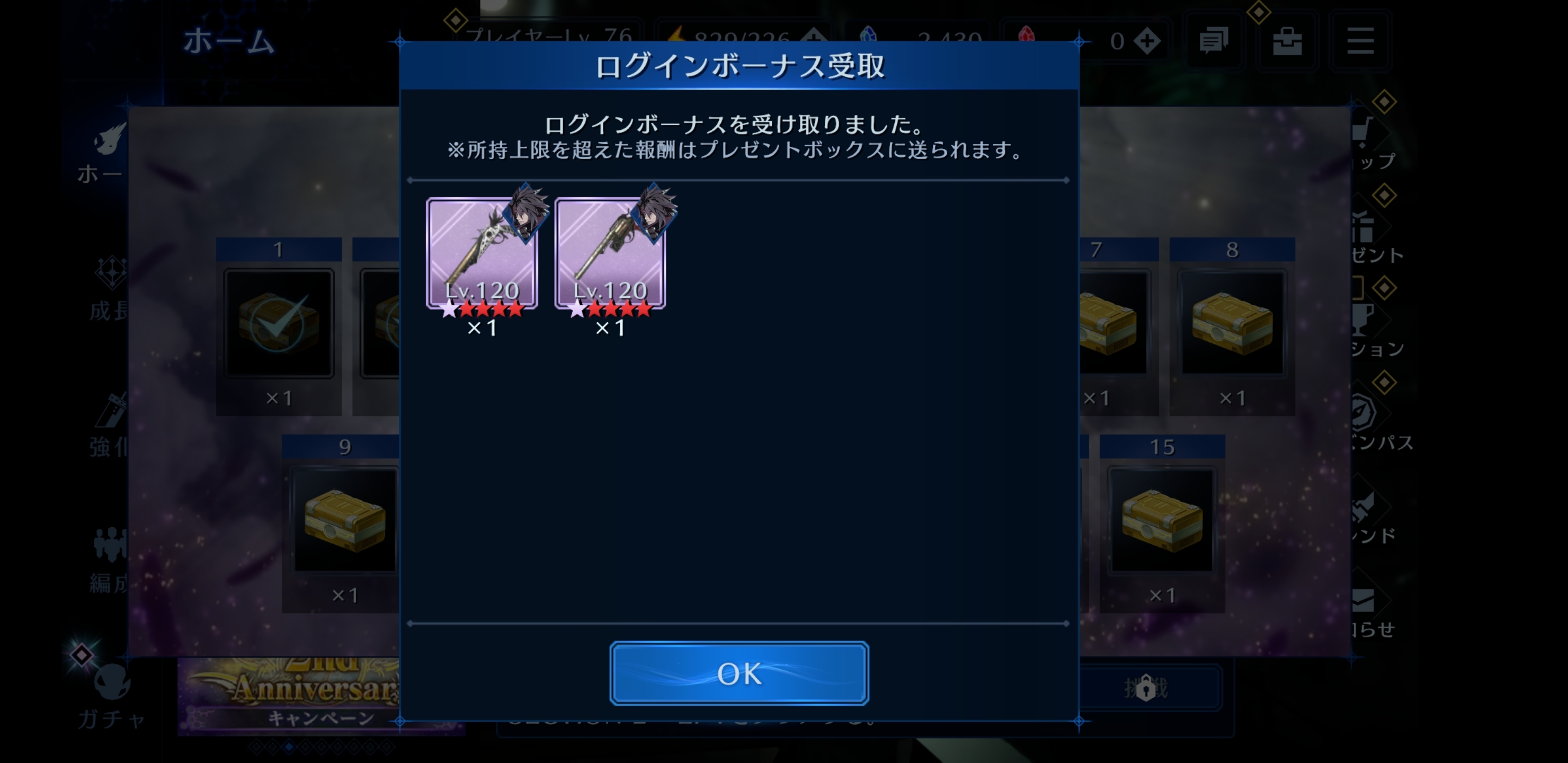 ACコラボとか、セフィロスがプレイキャラになったりとたいへん豪華&ボリューミーなんですが、個人的にすごくありがたいなあと思ってるのがログインボーナスで★6、しかもLV120の武器をもらえることです‼️😁✨