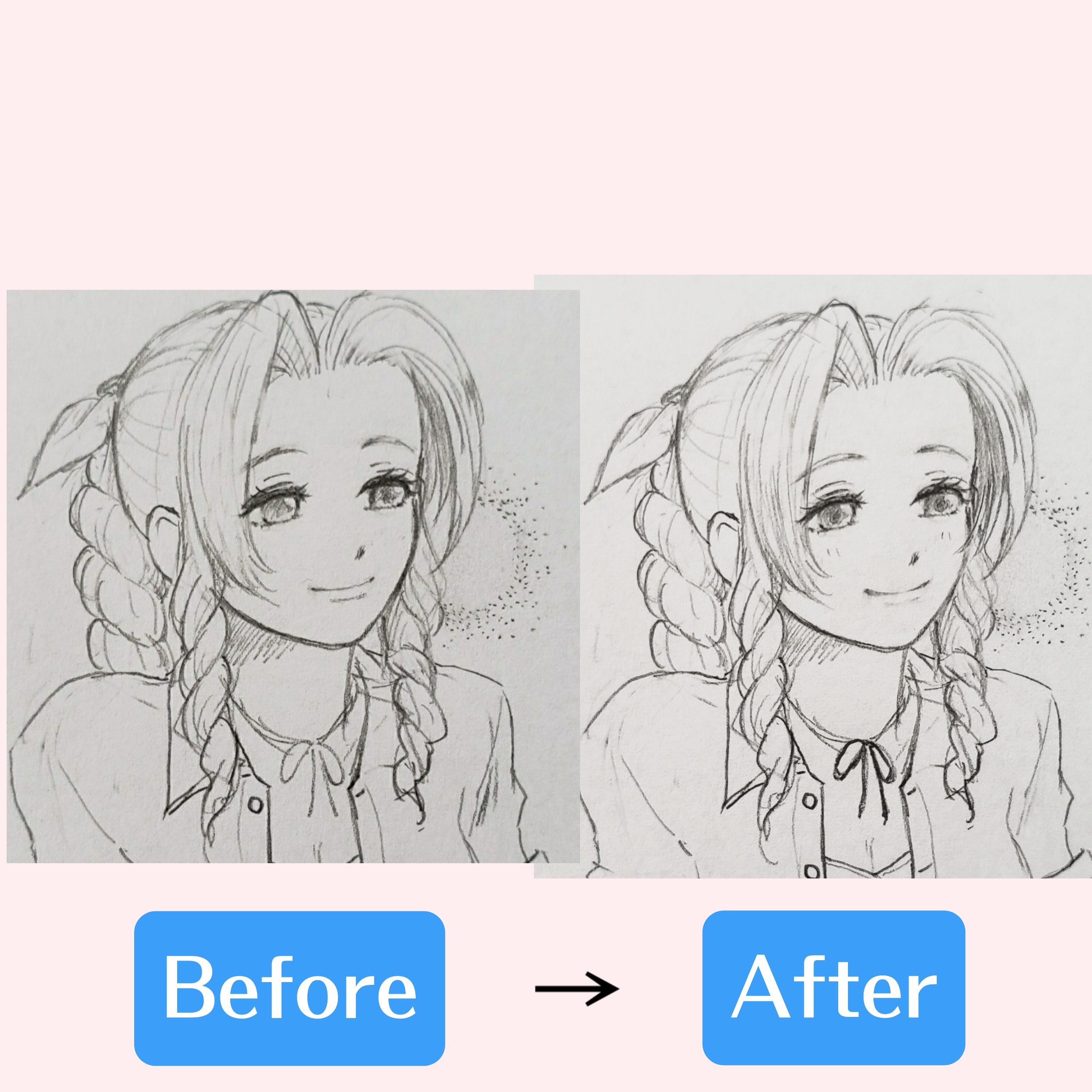 例えば添付した画像のエアリスですが、左側が手癖というか自分で描いたものです。もっとふんわりした笑顔にしたいのでアドバイスお願いします、と書くと