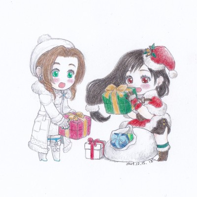 またまたECの衣装をお借りしました🙇♀️💕(ポーズは社交ダンスを踊っている人を参考にしました) 2枚目は途中経過です。 クリスマスのヴィン氏がメガネをかけてきたことに衝撃を受けまして、描かずにはいられませんでした…(カッコいいんだけど、他のゲームとかにこんなキャラいそうだなってちょっと思ってしまいました笑) この上着が…‼️中と、腕を挙げた時にどんな感じになるのかが全然全くちっとも分からなくて…これが私の限界でした🤣胸元の❄️も細かすぎてアワワ…(´Д`;) 本当はティファに上着を着せる絵も思い浮かんだのですが断念…😓 ヴィン氏のもふもふを背中側で留めてるアクセサリー??と、サンタ衣装ティファの帽子のブローチが似ていて(多分ひいらぎ)、ちょっとでも似た所があるとお揃いだと喜ぶオタクの心に刺さりました💘✨(胸元の❄️はエアリスとお揃いだと思ってたもんね…) 超、個人的なことなのですが、この絵でちょうどクロッキー帳が終わりました。次からは新しいクロッキー帳にお絵かきしますー😆💖来年もたくさん描きたいなあ… そして、もしかしたら年内はこれが最後の投稿になるかもしれないので… 皆さま、今年も一年間たいへんお世話になりました✨来年もよろしくお願いいたします❗よいお年をお迎えください🙇♀️💖