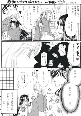 以前(そうっとう昔まだサークル活動してた頃です)の漫画描き下ろしです。友雅さんは以前が以前だけにネタにしやすかったので泰明さんより友雅さんのネタばかりが増えて行った記憶があります。(苦笑)これはトーンもベタもアナログです。なので文字も手書きという。見づらいと思いますがみなさんをお待たせしてるのでアップしました。本当にお待たせして申し訳ない。