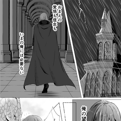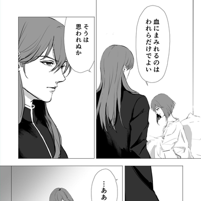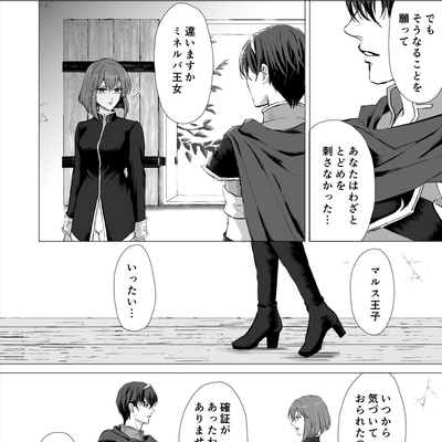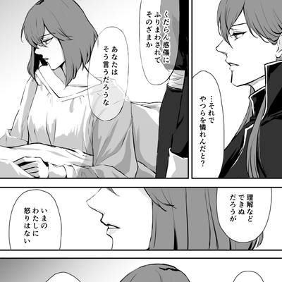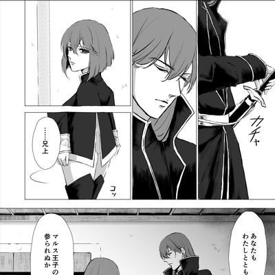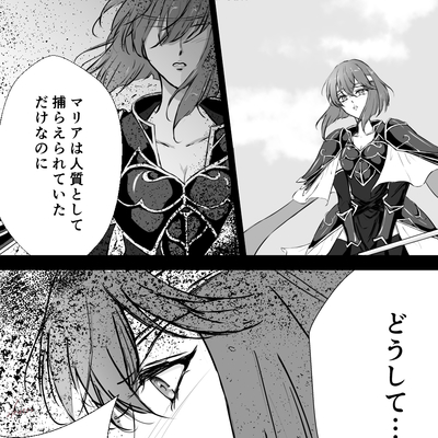 『罪と罰』は、第二部九章のミシェイルとミネルバの会話+αのつもりで書きました。と言いますのも、ゲーム本編の会話は設定説明的な要素が強くて、あの二人があの場面で今更交わすべき会話ではないな、と以前から感じていたからです。例えばグルニアと組んでドルーアを滅ぼす云々は暗黒戦争が始まる前(もしくはドルーアとの同盟の前)にミネルバとは共有していた話でしょうし、父王暗殺の真相も第一部でミネルバがミシェイルを裏切る前には交わされていていいような内容だと思っています。 このシーンが二人の今生の別れになるわけですが、この時点で彼らが交わす話はやはりミシェイルがこれからどうするつもりなのかということがメインだったのではないかなと思い、このような漫画を描くに至りました。