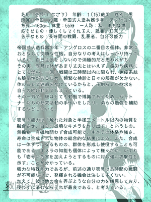 聡明な人造人間の少年。参号と弐号の兄。特殊な力を有するものの、虚弱体質で細かな体調管理が欠かせない。そのせいか、非常に遠慮がちな性格。