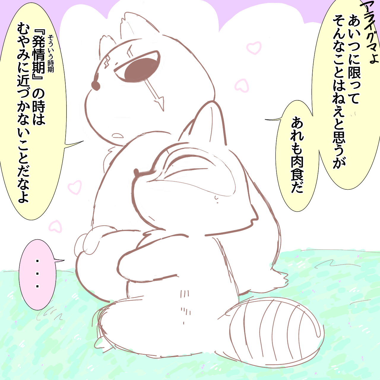 誰かさんがそういう時期に入ると(クズリさんもスナドリさんも肉食獣だそうなのでどちらの世界線でもOKダネ‼︎)言い聞かせに来てくれる大将と、あまりにも毎年言われることなので「俺はそんなに頼りなく見えんのか...?」と困惑するアラ父🧘🏻♂️