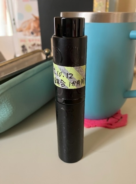 服の袖にワンプッシュ。本当は一か月置いてなじませるんだけど、試しにシュッとした。