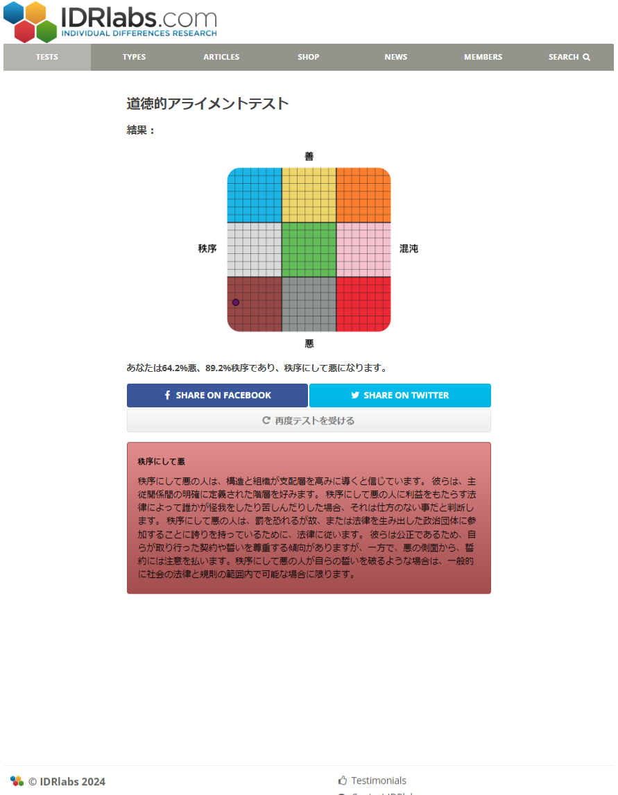 という訳で、今回は日付が変わる前にもう一度此処を更新したいと思ったが為に「久しぶりに試してみるか!!ww」の精神でIDRlabs.comの『道徳的アライメントテスト』(https://www.idrlabs.com/jp/moral-alignment/test.php)を試してみた所、回答中の心境(※記事タイ参照)に反して『秩序にして悪』とかいう結果が出てしまった上、善or悪の数値が前回以上に悪寄りになっていた所為でちょっぴり凹んだ(何とも言い表し難い残念感を覚えた)気がする俺が唐突に通りますよ、っと……(´A`)←