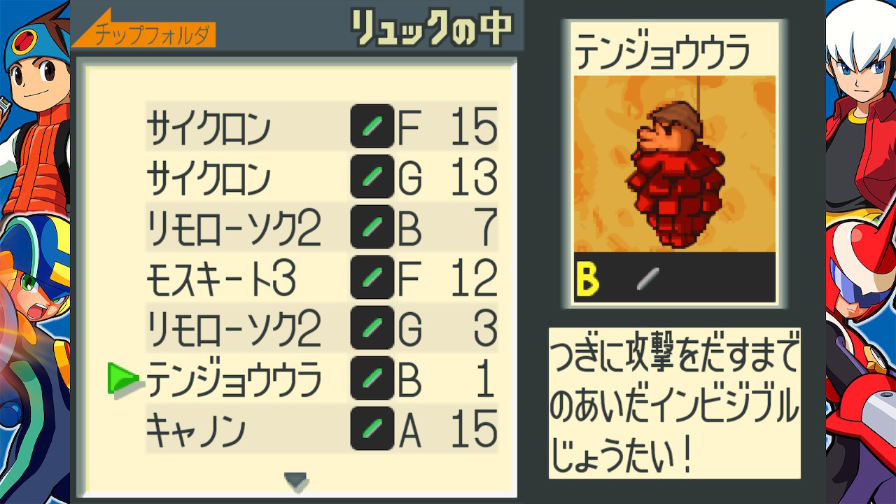 という訳(?)で、一昨日迄の疲れがまだ取れ切っていないのか何だか気力不足だった今日の俺は夕飯前に『ロックマンエグゼ アドバンスドコレクションVol.1』を遊んでおり、エグゼ1のデータライブラリ埋め作業の為にインターネットエリアの奥の方を彷徨っていたんだが、ふとした瞬間にチップフォルダの編集画面を開いてリュックの方を覗いてみたらいつの間に入手していたのか分からないバトルチップ『テンジョウウラ B』が視界に入った為「……エッ?(゜Д゜;)(※困惑)」という表情にならざるを得なくなってしまったんだよなー……という事を此処に書き残させて(+気付いた当時のSwitch画面スクショを添付させて)頂きます、ハイ(゜A゜)←