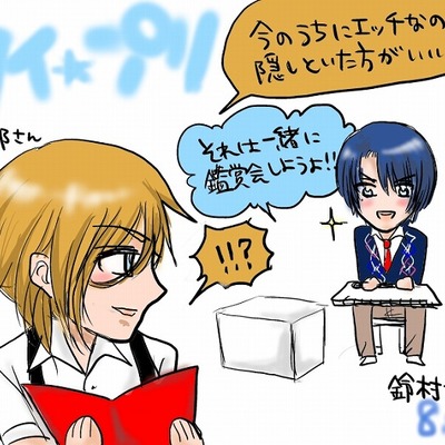 「クイズの王子さま」レン役(諏訪部順一さん)、マサ役(鈴村健一さん)のお2人の回一部をイラストで描いてみました。 もうこのお2人は、私以前から他のアニメとかでも大好きでして夢中になって見すぎてお2人が着てた服覚えてないし、サイトにイラスト描こうと思って他の人資料にきっちり細かく書いてあったのにこの2人点数しか書いてなかったwww ヒント与えまくりの優しい諏訪部さんに対し、ヒント貰いまくったのに周りで踊ったりして邪魔する鈴村さんがめちゃくちゃ可愛かったです(*^0^*) そして妨害受けても1位取った諏訪部さん凄い!!w 「罰ゲームきっとプライベート訪問だよ」 「来るな!入れねぇよ!」 「Hなの今のうちに隠しといた方がいいよ」 「それは一緒に鑑賞会しようよ!」キリッ って流れがおもろかったww