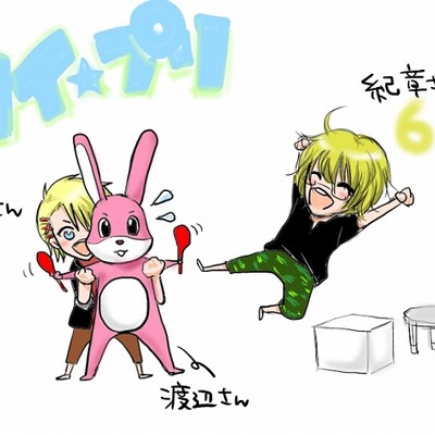 アニメDVD特典の「クイズの王子さま」での、那っちゃん役(谷山紀章さん)と翔ちゃん役(下野紘さん)の回一部を絵で描いてみました。 クイプリには毎回左横に鎧とか像とか冷蔵庫とかww色々あるんだけど、初めて人っていうか…着ぐるみの人(渡辺さん)が置かれてた回でしたw 渡辺さんを弄り始めるお2人…特に紀章さんの飛び蹴りは爆笑でしたww 下野さんごとぶっ飛ばしてて腹筋崩壊wwwww 紀章さんが下野さん可愛がっているのが伝わってくる2人のクイプリでした! くるぶし削るとかww まるでほんとに那翔のような2人だ…可愛い*^v^*