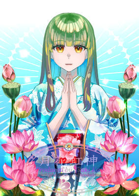 なぜ虹の佛さまなのかというと、100チャレの時点で髪色にグラデを掛けた色合いが気に入っていたのと、自身で撮影した虹の写真を背景にさり気なく重ねていたので、なんとなく『虹佛』という言葉が思い浮かびました。