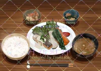 メインのお皿やお味噌汁、煮物等は、良い感じに描けたと感じていますが、ごはんを描く難しさを知った1枚になりました。