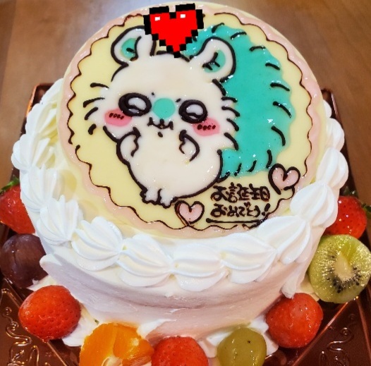 で、毎年恒例のケーキ。今年はモモンガです。あざてさが目一杯出ててよき、かわ。呟き