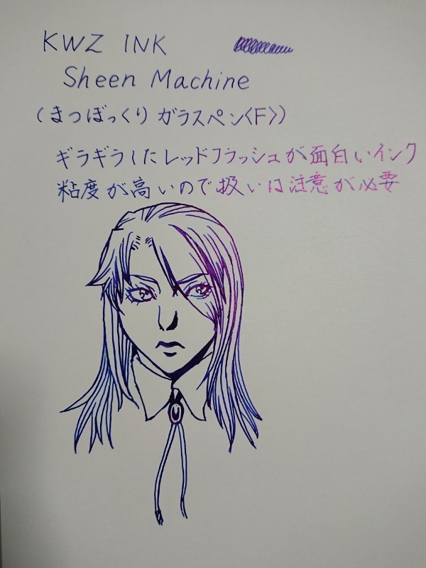 性懲りもなく新しいインクとガラスペンをお迎えしてしまいましたが、エグいほどにギラギラとフラッシュするインクを買いました。ベースは青ですが、傾けたりすると箔押ししたかのようなメタリックな赤に見える面白いインクです。