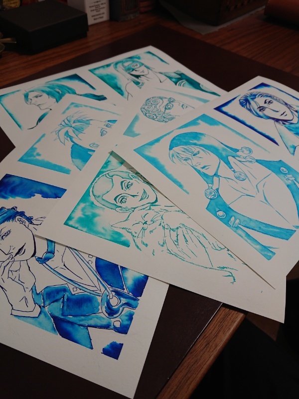 20200621(日)14:06Clear Oceanシリーズのインクで暗チを描きたくなったので全員+ジャックドーを描きました。ジャッキーは用紙1枚に2人で描いていたら余ったので。