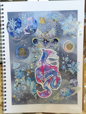 絢斗さんの描いたドラゴンを利用したコラージュを作りたいな〜と思い、Skeb依頼で描いていただいたドラゴンのイラストを使わせていただきました!こちらも海と宇宙をイメージしたもので、ドラゴンはベタとリュウグウノツカイをモチーフにしています。それにしてもこのドラゴン美しいな・・・。