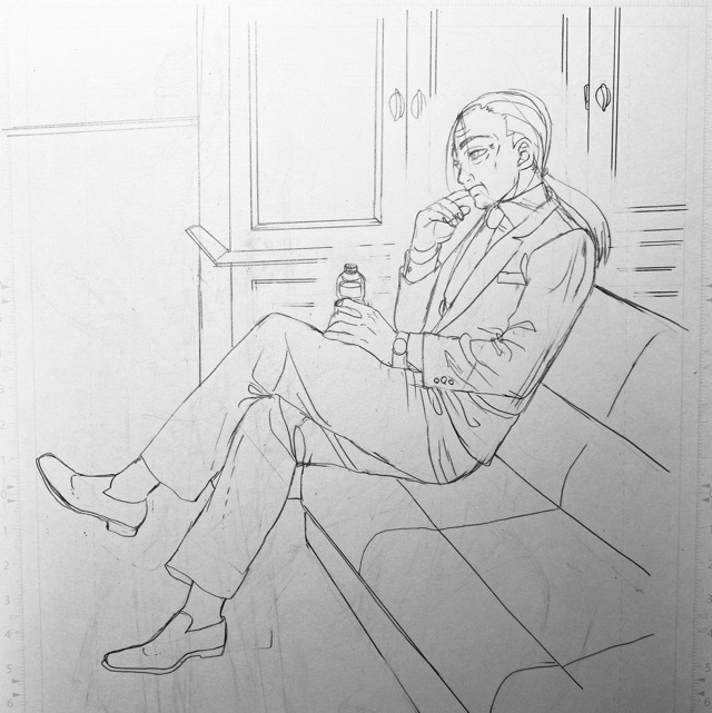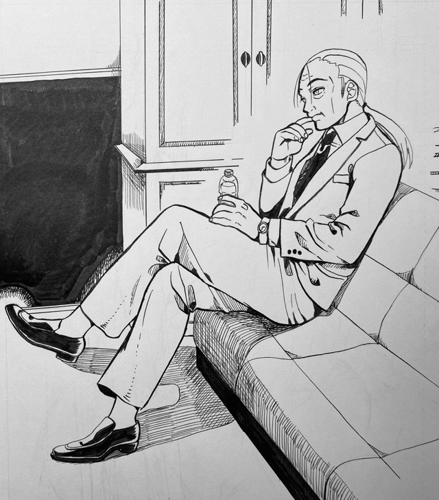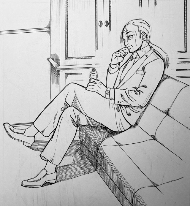 20250525(日)00:05モノクロにこの間から描いてたポーズ集を見ながら描いたおじさんを追加しました。