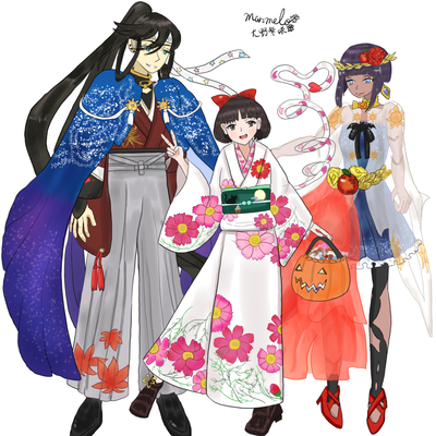 前回出番がなかった紫咲・兼さん・夜翰さんで、ハロウィンとお月見をイメージして衣装デザイン考えてみました。