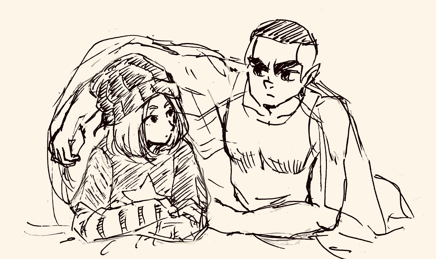 あくうが毛布の中で冷えきった手をはーはーしてさすってたら大きい手でやわらかく握り込んであっためる仕草を毎回真顔でやる叶子、にぎにぎされるがままに街で仕入れた情報を淡々とつぶやいていく阿赫、なんなんだ…無題