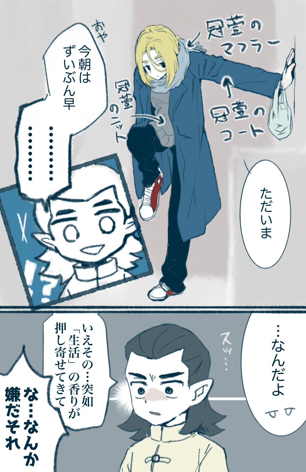 20230112(木)20:01個人的には起き抜けにちょっとコンビニ行くなどと言って彼シャツ彼コートを無言で借りて引っ掛けてくのは冠赫のあくーなんだ あまり体格に差もないし、謎のギザギザへのこだわりが滲んでないベーシックなやつなら躊躇なく着そう 寒いので