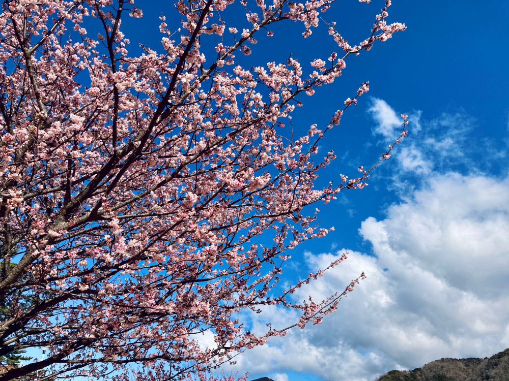 ↓は日本一早咲き(諸説あり)の土肥桜でした 海とのコントラストも優れてたけどとにかく風が体に突き刺さるんよ