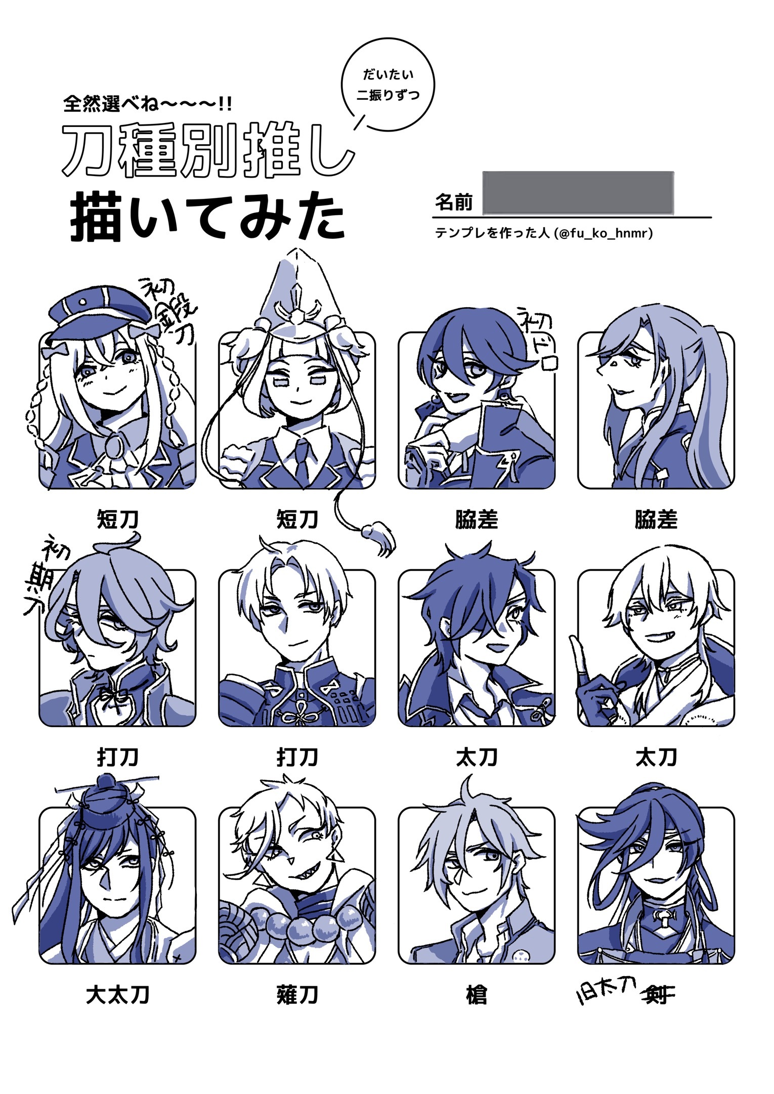 歌仙、長谷部、青江、国広、前田、乱が1番隊