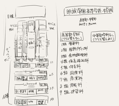 学科分けは私が通ってた高校と弟が通ってた高校の学科合体させたので商業とか工業とかいろいろごちゃまぜのありえないであろう組み合わせの欲張りセットとなっております。A棟は高等部の人たちが使っててB棟は中等部の人たちが使ってる。