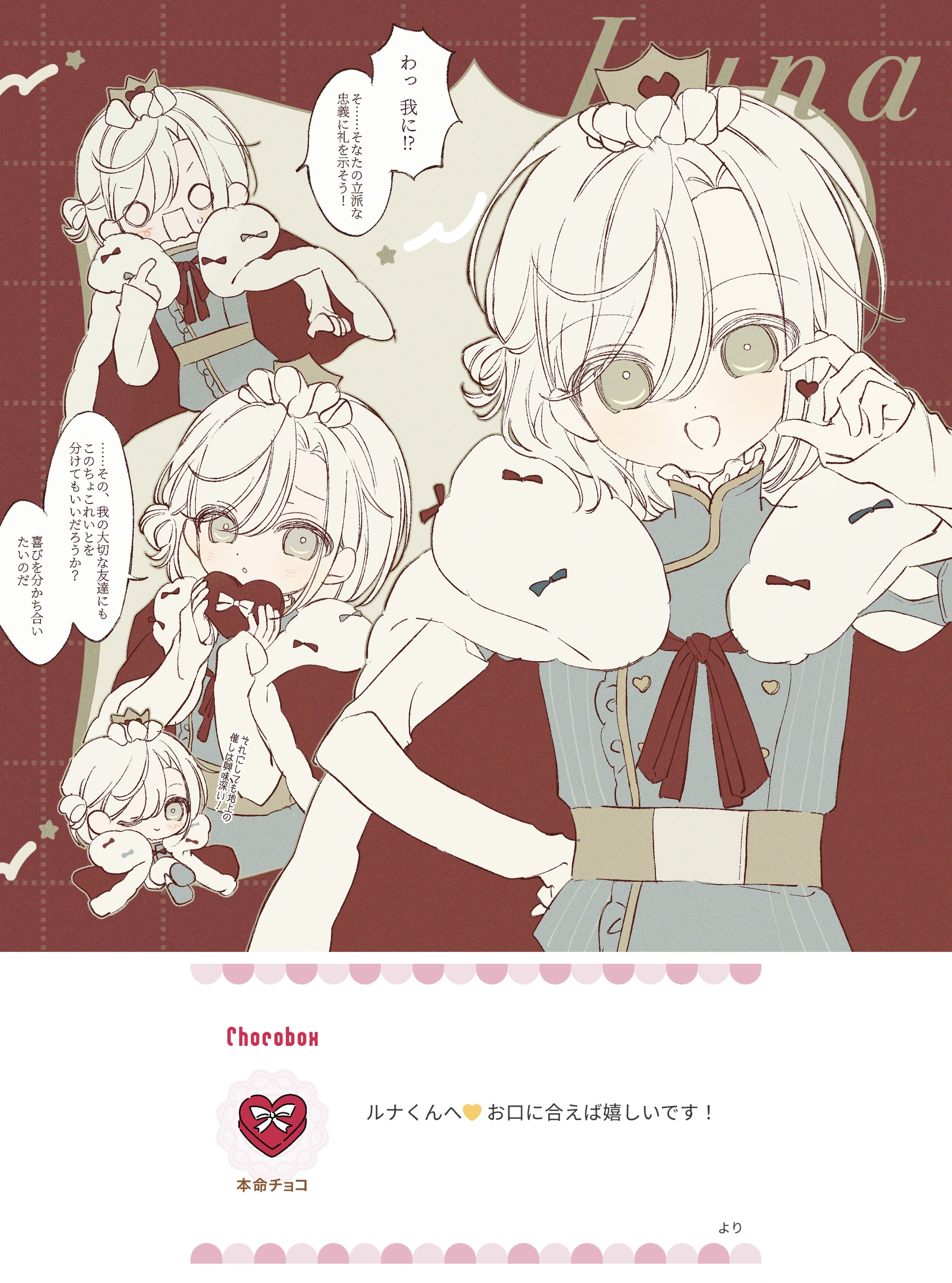 大昔は月の国と地上の世界で交流があって、ルナと月がお顔似てるのもそれが理由なのですが、本に書いてあったことは嘘じゃなかったんだ! っていう証拠だからルナは嬉しかったし初めて会った時から無条件に月のことが好き。