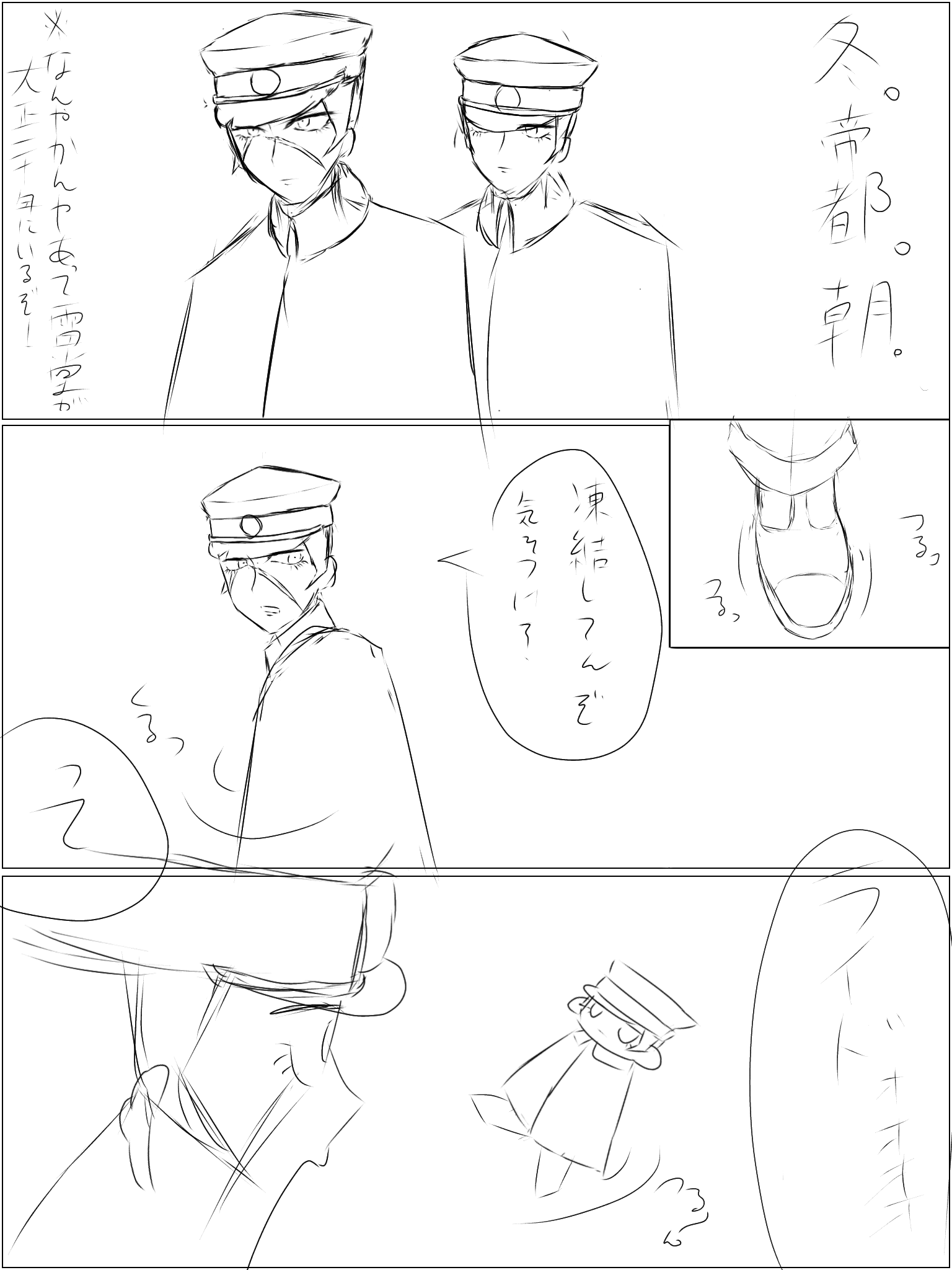 書きかけの三文芝居みたいな漫画つけときました。絵はもちろんのこと、字が異様なまでに汚いけど許してください。