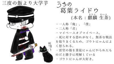 名前の元ネタは某緑茶(清涼飲料水)です。この名前にしたせいで本名が出る度に笑ってしまう…。