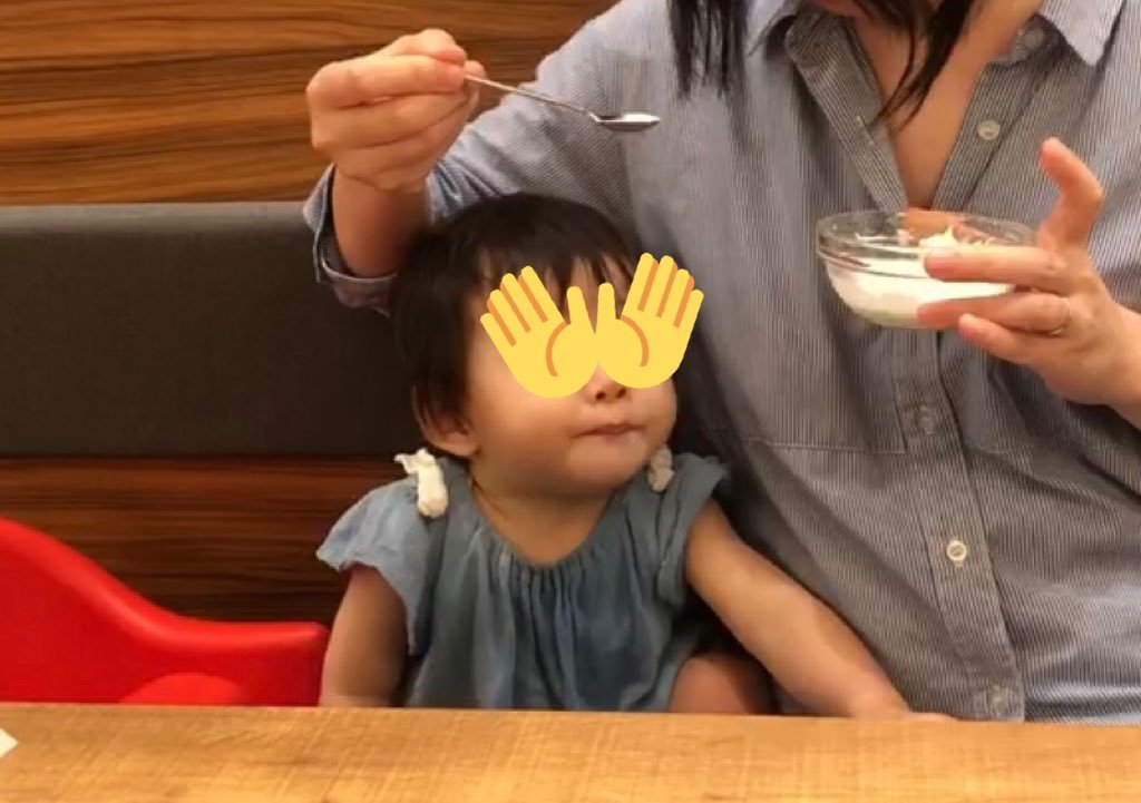 これはデザートのソフトクリーム(最近娘氏が大好きなおやつその1)を欲しそうに口元もちゃもちゃしてる娘氏です。