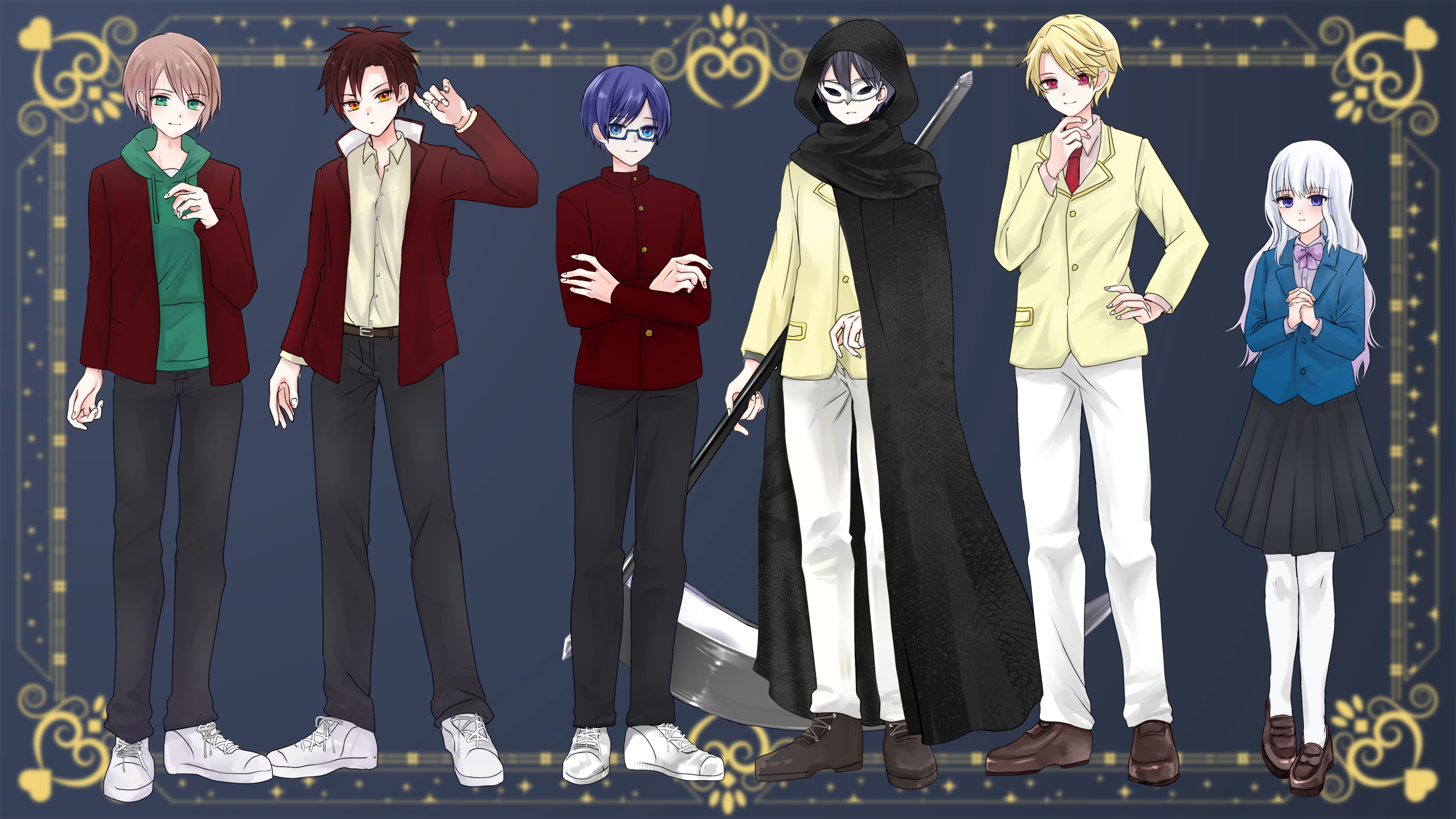 今回はこれまでの物語とは異なり、舞台は現代社会。高校生達が主人公です。ですので、立ち絵のデザインは学生らしく制服で描いていただきました。