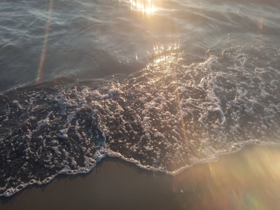 その帰りに撮った海辺(波打ち際)と夕陽です。