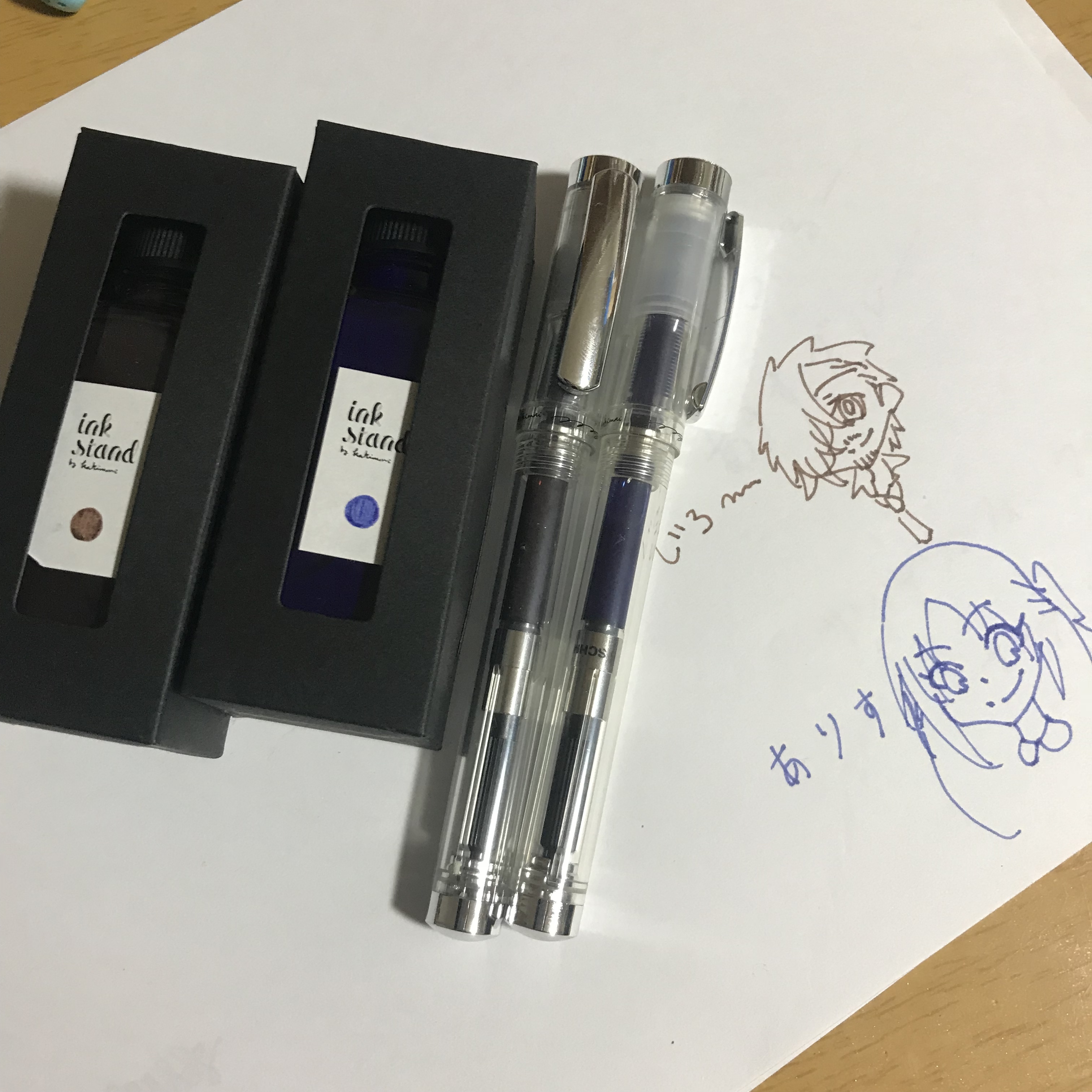 まあ青はもともと絵の主線に使ってたから絵にも字を書くにも使えるなと考えていましたが茶色は茶色で肌なじみがよくて主線に使えるしコーヒーブラウンだから文字としても見やすい色になったのでなにか字を書くにも使えるし。