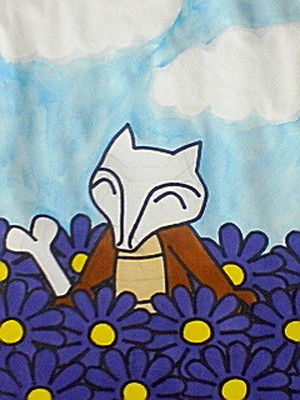 赤緑青ピカチュウバージョンとFRLGでロケット団に殺されたカラカラのお母さんであるガラガラが主人公の手によって天国へと旅立ち、紫苑のお花畑から「カラカラ、あなたの事をいつでも見守っているからね。」と優しく語りかけているというコンセプトで描きました。